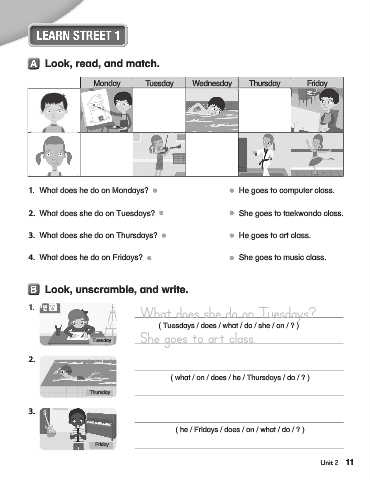 4. What does he do on Fridays? She goes to music class.