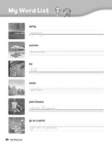 My Word List Unit 8 spring spring summer summer fall fall winter winter plant flowers plant flowers go on a picnic go on a picnic 66 My Word List L4_WB 본문 (재판용).indd 66 2017. 3. 30. 오후 5:25