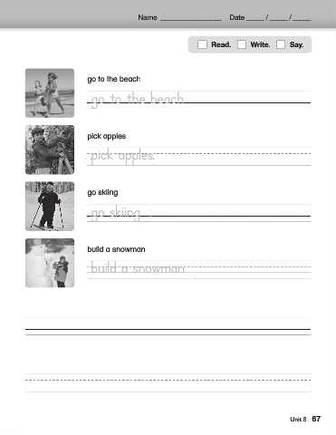 Name _________________ Date _____ / _____ / _____ Read. Write. Say. go to the beach go to the beach pick apples pick apples go skiing go skiing build a snowman build a snowman Unit 8 67 L4_WB 본문 (재판용).indd 67 2017. 3. 30. 오후 5:25