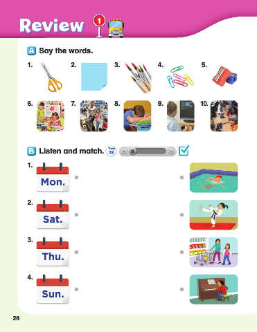 Review 1 Say the words. 1. 2. 3. 4. 5. 6. 7. 8. 9. 10. Listen and match. Track 32 1. Mon. 2. Sat. 3. Thu. 4. Sun. 26 2021. 2. 25. 오후 1:48 L4 본문 final_20210218.indd 26 2021. 2. 25. 오후 1:48 L4 본문 final_20210218.indd 26
