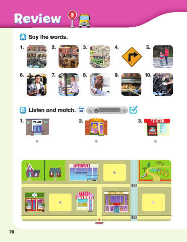 Review 3 Say the words. 1. 2. 3. 4. 5. 6. 7. 8. 9. 10. Listen and match. Track 90 1. 2. 3. A T T R START S S STARTTART 70 2021. 2. 25. 오후 1:52 L4 본문 final_20210218.indd 70 2021. 2. 25. 오후 1:52 L4 본문 final_20210218.indd 70