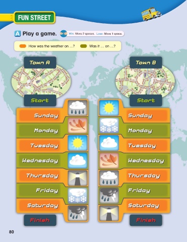 Play a game. Win: Move 2 spaces. Lose: Move 1 space. How was the weather on …? Was it … on …? 80 2021. 2. 25. 오후 1:52 L4 본문 final_20210218.indd 80 2021. 2. 25. 오후 1:52 L4 본문 final_20210218.indd 80