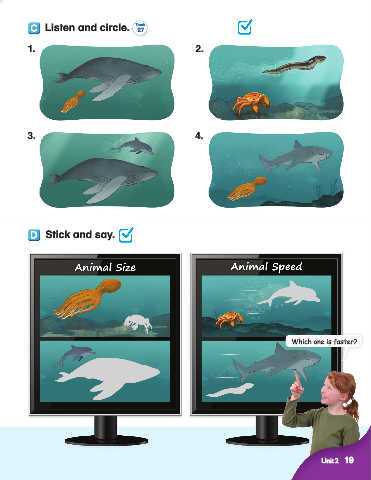 Track Listen and circle. 27 1. 2. 3. 4. Stick and say. Which one is faster? Unit 2 19 2021. 4. 26. 오후 5:59 L6_U1,2_202104.indd 19 2021. 4. 26. 오후 5:59 L6_U1,2_202104.indd 19