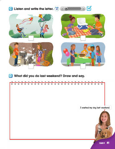 Track Listen and write the letter. 57 What did you do last weekend? Draw and say. I washed my dog last weekend. Unit 4 41 2021. 4. 26. 오후 5:56 L6_U3,4_2021.indd 41 2021. 4. 26. 오후 5:56 L6_U3,4_2021.indd 41
