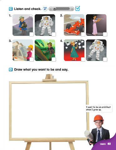 Listen and check. Track 87 1. 2. 3. 4. Draw what you want to be and say. I want to be an architect when I grow up. Unit 6 63 2021. 4. 26. 오후 5:45 L6_U5-8_2021.indd 63 L6_U5-8_2021.indd 63 2021. 4. 26. 오후 5:45